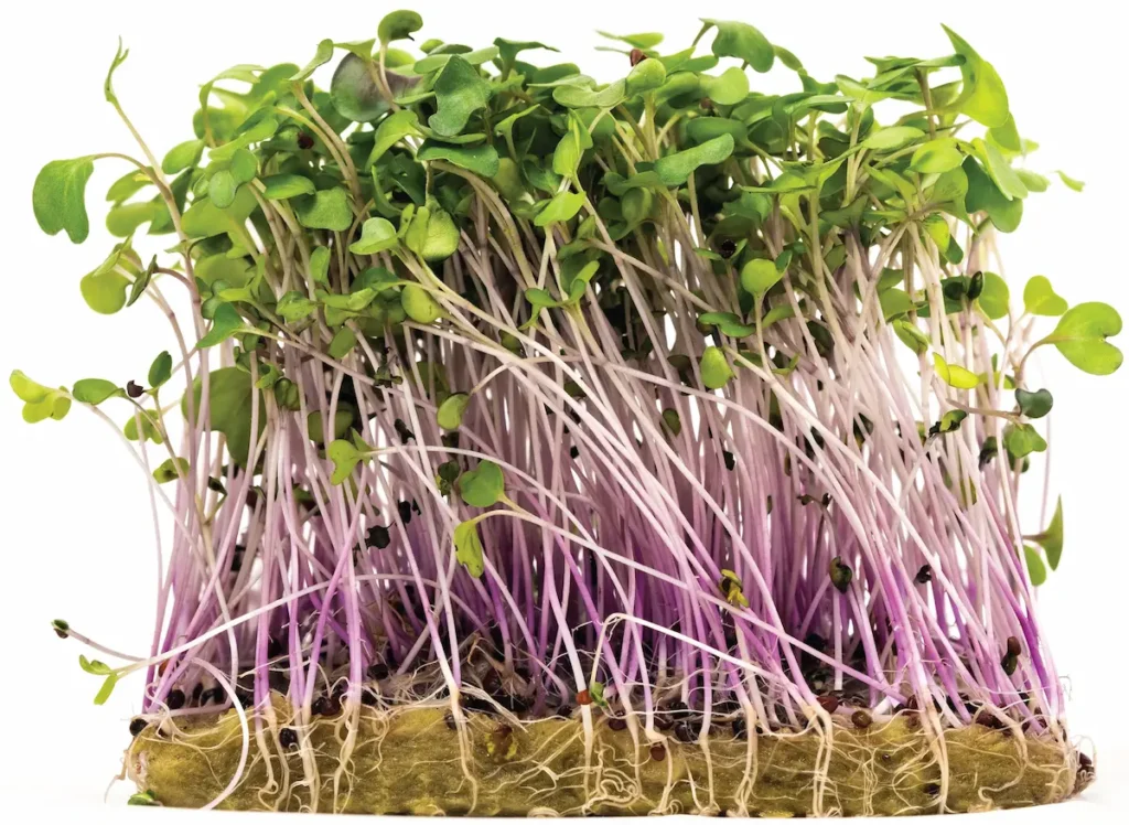 5–7 cm with frilly green leaves and offers a gentle mustardy flavor.